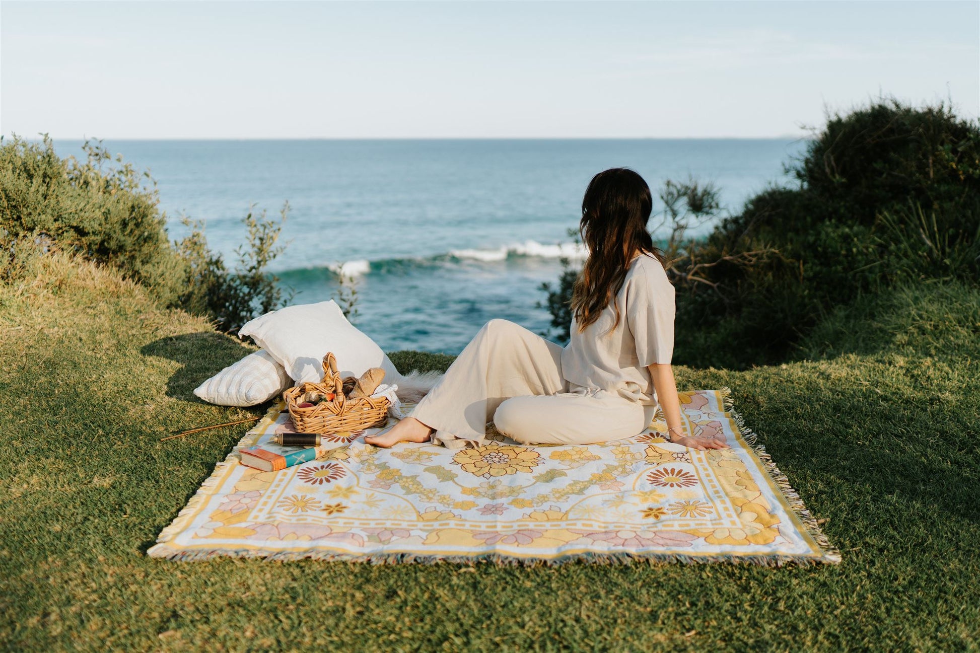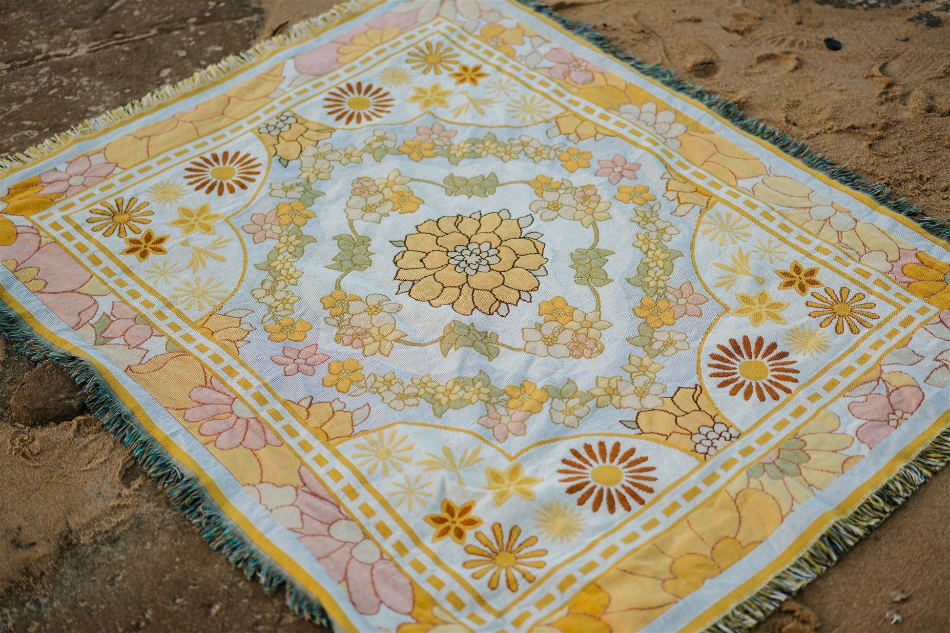 The epitome of sunshine all wrapped up in our stunning 'Mabel' design. Adorned with vibrant yellow hues and a whimsical floral design, the 'Mabel' effortlessly combines comfort and style and will allow you to embrace the spirit of wanderlust while bringing the bohemian charm to your outings. Available in two sizes to allow room for the whole family or a moment alone soaking up the warmth as the world goes by.